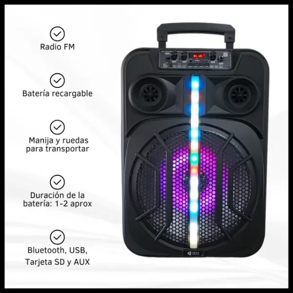 Desde un asado hasta una fiesta al aire libre, este parlante es ideal para animar cualquier evento. Canta tus canciones favoritas con amigos, ambienta tus espacios con luces LED RGB y disfruta de horas de reproducción.