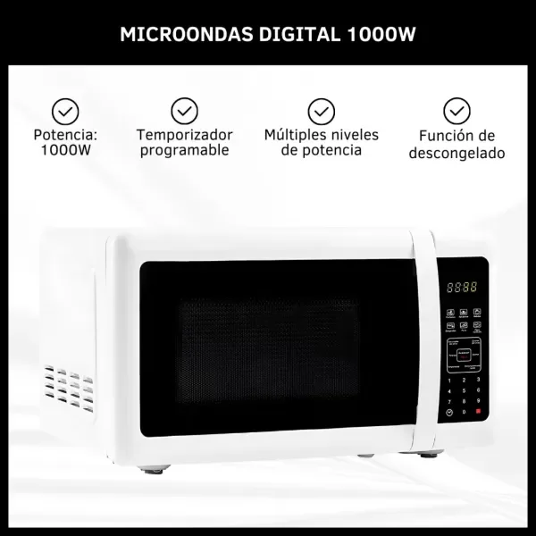 - Prepara tus comidas en segundos con este microondas digital de 1000W, ideal para calentar, cocinar y descongelar rápido.