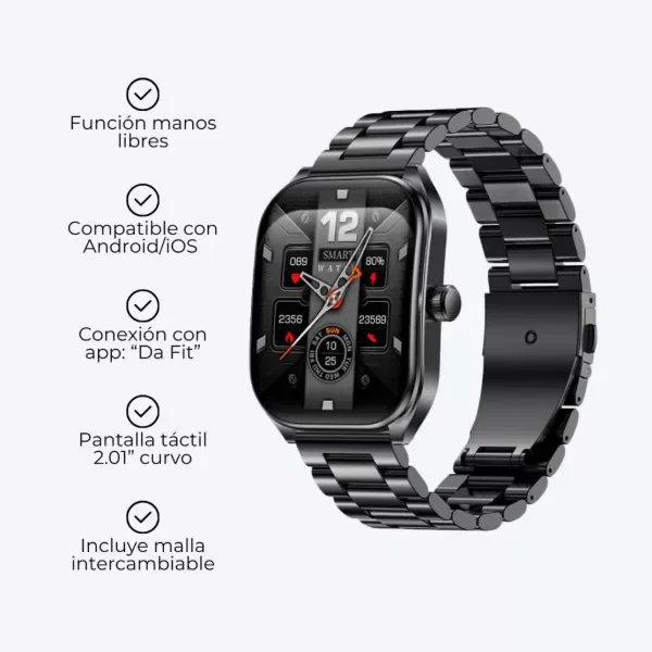 Este reloj smart combina diseño moderno y funciones inteligentes para acompañarte en cada momento del día. Te permite mantenerte conectado, controlar tu actividad diaria y gestionar notificaciones desde tu muñeca, brindándote comodidad, estilo y practicidad en un solo dispositivo.
