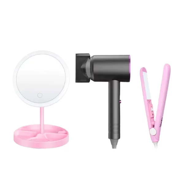 El combo perfecto para un peinado prolijo en minutos: espejo, secador y mini planchita, todo lo que necesitas para lucir impecable sin complicaciones. Además, por su tamaño compacto son ideales para llevarlos a todos lados.