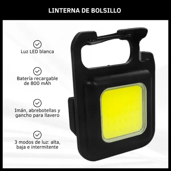 Esta linterna mini de bolsillo es la solución ideal para quienes buscan una fuente de luz compacta y versátil. Se adapta perfectamente a tu llavero, bolsillo o mochila, convirtiéndola en un compañero indispensable para actividades al aire libre. Con su imán incorporado, puedes fijarla fácilmente a superficies metálicas, brindando una mayor comodidad en situaciones de emergencia.